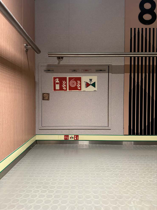 A story about implementing escape route signage onboard cruise ships or ferries will sound like a technical job to many. A large amount of exit signs, stickers and strips, but not something that requires a lot of thinking. Even today on cruise ships and ferries we can still see the lack of safety signage and the knowledge behind it, LED signage and or photoluminescent or, on the contrary, a jungle of exit signs and stickers that all scream for attention, sometimes with conflicting messages, where the essential safety message is lost in the crowd.
